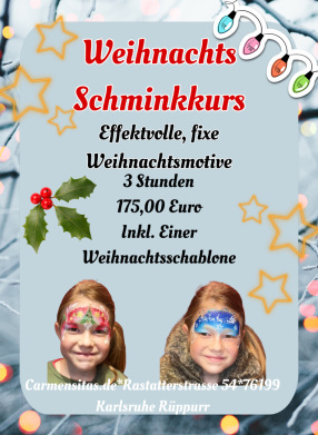 In unseren Saisonalen Kursen zeigen wir Designs speziel zur Saison. Es werden schnelle Designs mit Schablonen gezeigt, aber auch wie sie Alltagsdesignes in Weihnachtsdesigns. Es sollten Grundkenntnisse des Kinderschminkens vorhanden sein. Also mindestens ein Grundkurs sollte besucht worden sein.